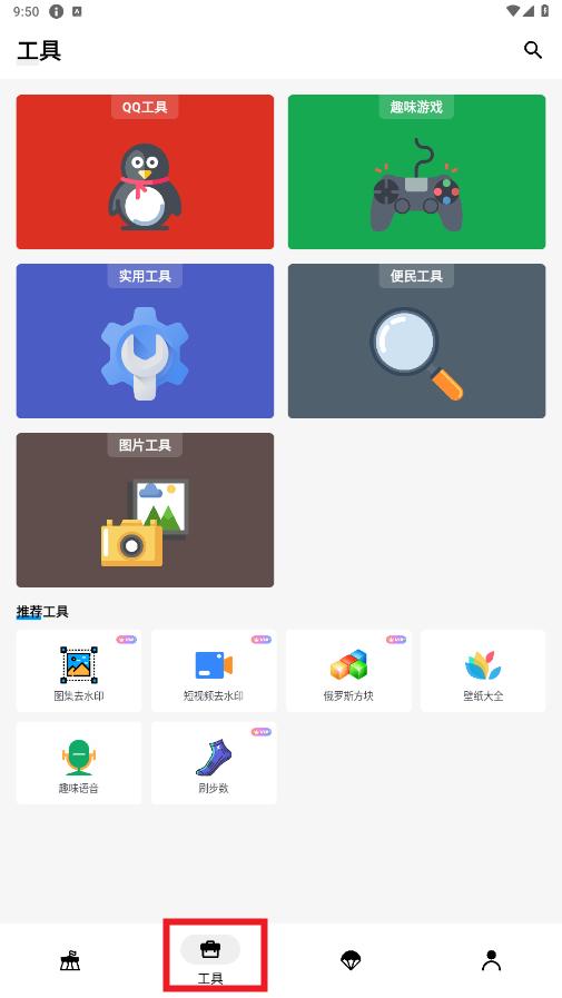 6.工具界面,为用户提供了qq工具,趣味游戏,实用工具,图片工具,便民工具等