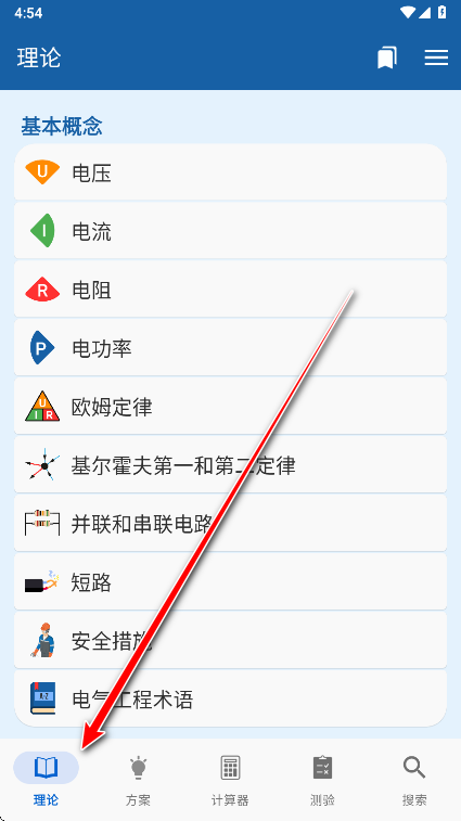 1.打开电工手册,可以看到第一个板块是理论,大家可以自由点击查看。