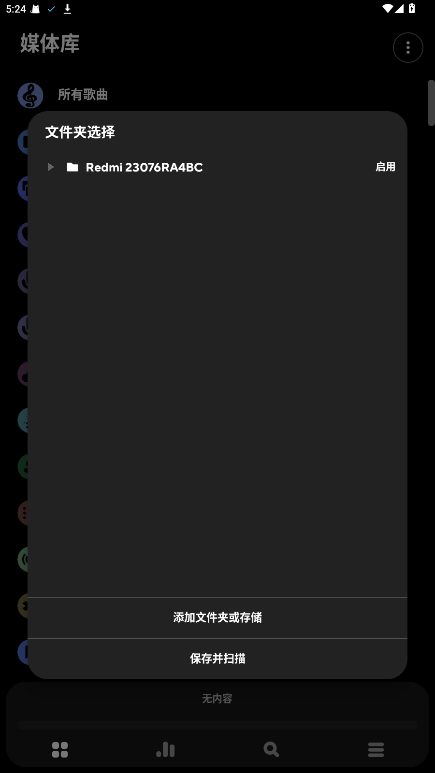 如果您发现某些音乐文件没有被自动识别,您可以手动将其添加到poweramp中。右上角三个点>“选择文件夹”,在这里您可以添加想要poweramp扫描的新文件夹。只需点击“添加”按钮,然后选择包含您音乐文件的文件夹即可。