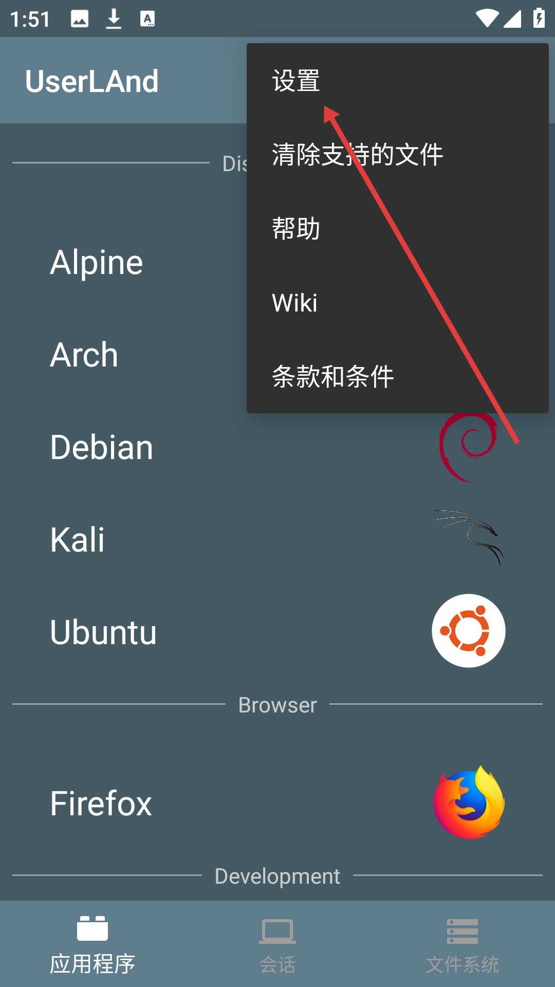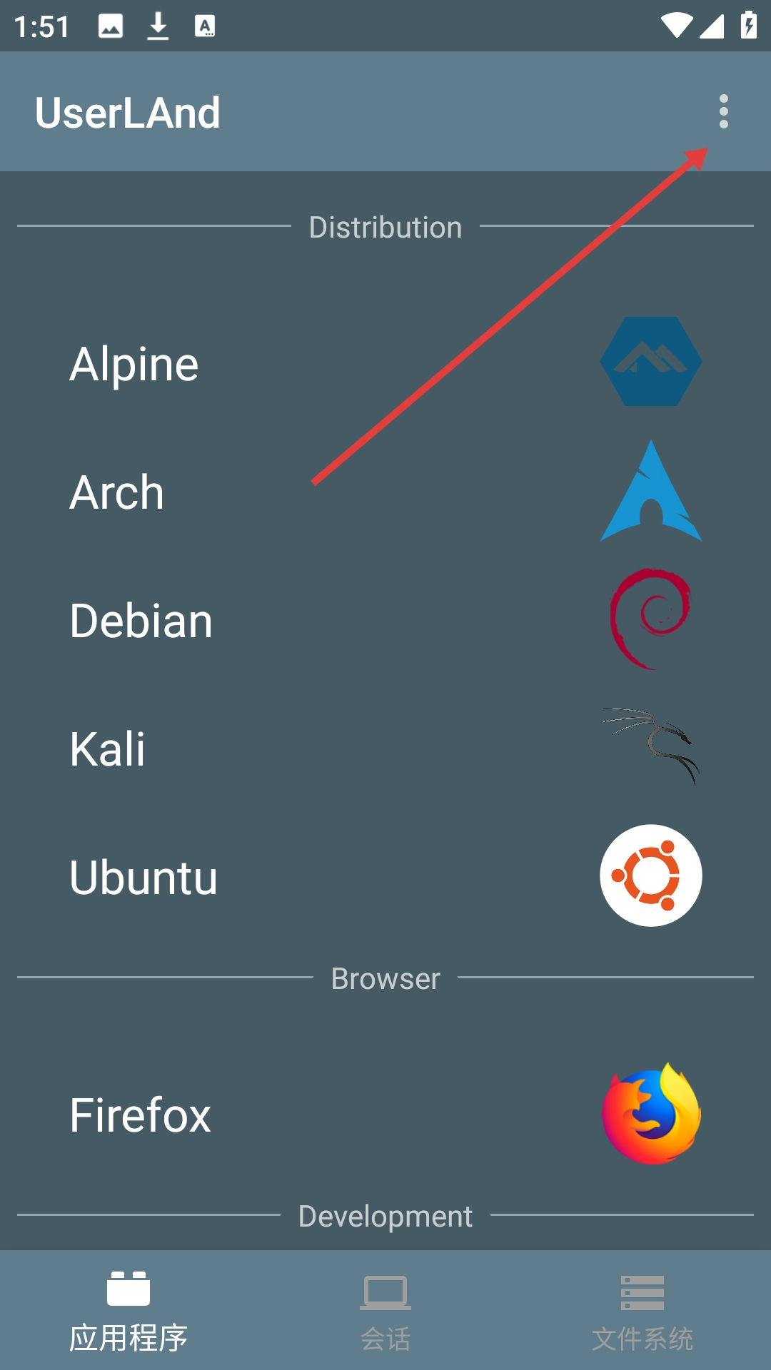 1、当 UserLAnd 首次启动时,它会显示常见发行版和 Linux 应用程序的列表,例如用户想要通过它来安装Kali