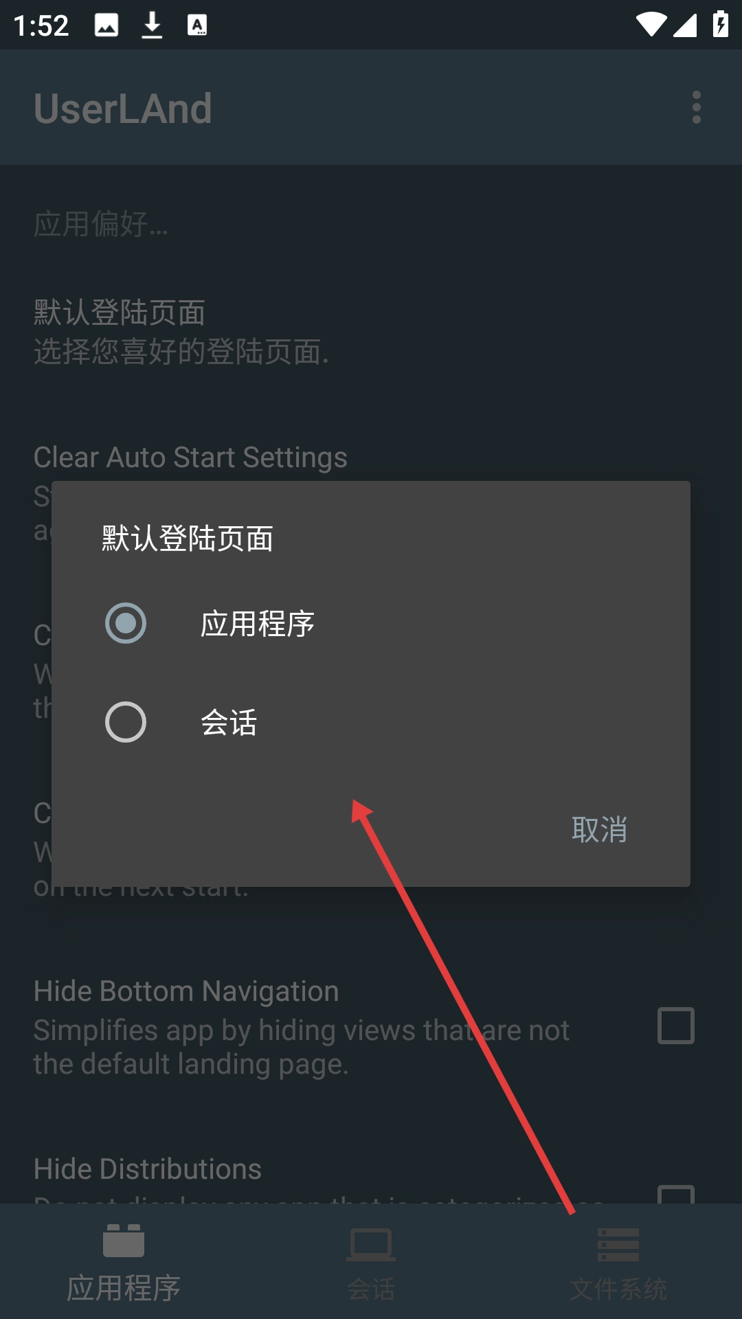 4、在登录页面的选择框中挑选自己偏好的登录页面类型,例如【应用程序】或者【会话】。