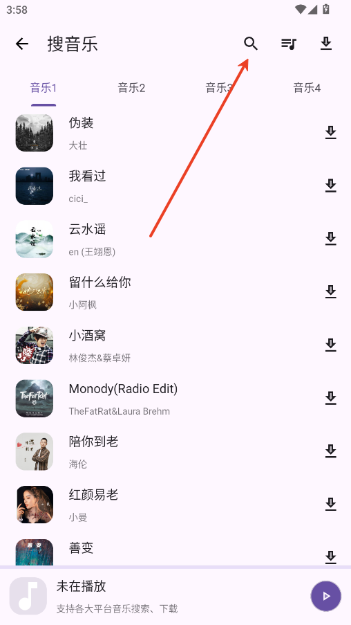 5.右上角搜索按钮可以快捷的找到你想听得歌曲。