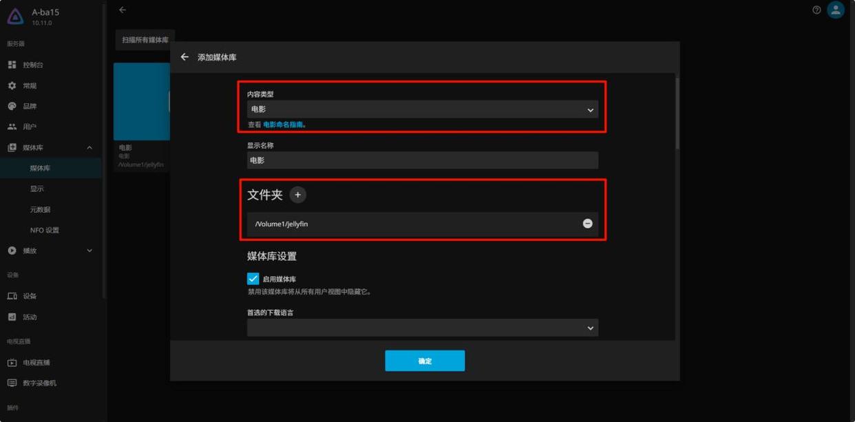 设置媒体库名称并添加媒体文件所在的文件夹,还可根据需求设置其他选项,例如元数据下载器、图像保存位置等。点击“确定”保存设置。