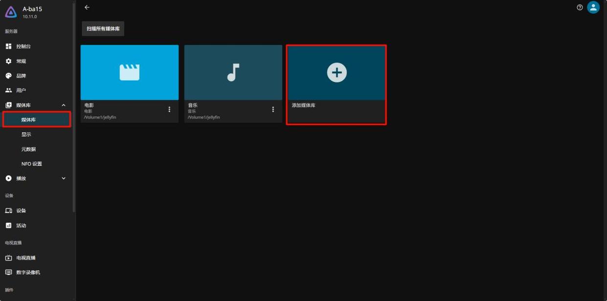 保存后,Jellyfin 会自动扫描媒体文件并下载元数据。你也可以在控制台首页点击“扫描所有媒体库”手动扫描媒体文件。