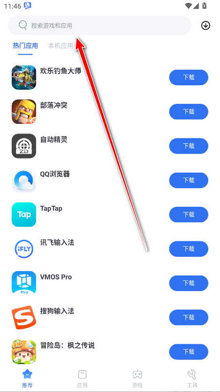 1.打开VMOS应用市场,点击上方的搜索框。