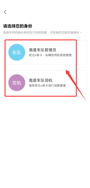 2.随后选择身份,如车队管理员可管理加油卡、车辆及驾驶员信息。