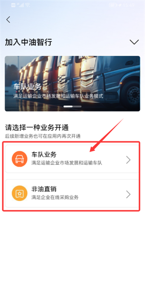 1.进入申请页面,从车队业务与非油销售中选择需开通的服务类型。