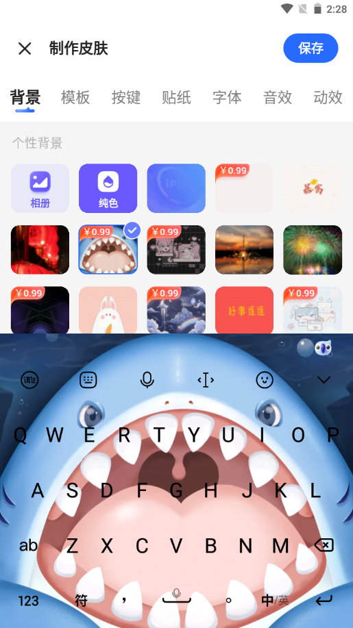 3、在这里自定义皮肤,可以从相册选择背景。制作完成后点击保存即可。