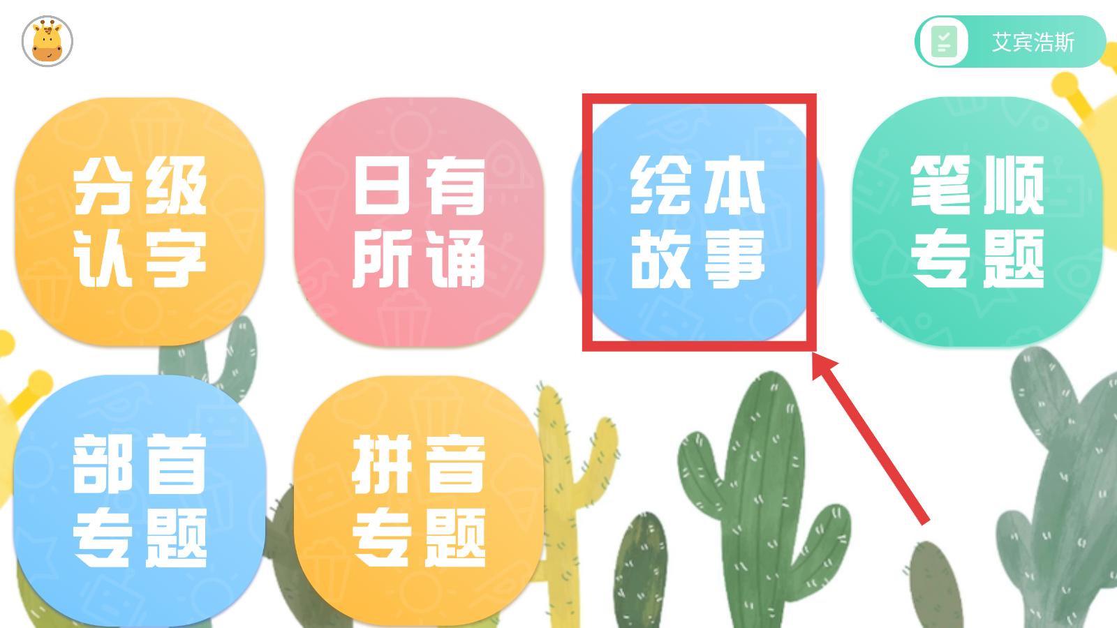 2.进入这个界面后,跟随箭头的指引,将视线移到右上角,点击故事绘本,跳转到下一个界面。