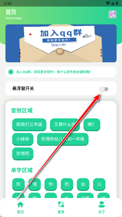 1.打开三年级耀星语音盒,可以看到有音效区域、单字区域、音乐区域。