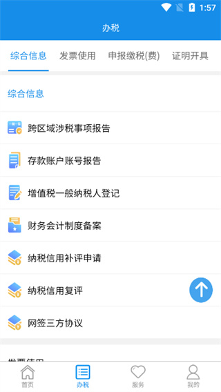 2.您可通过本版块操作“我要办税”功能类别,发起基础涉税业务的办理,包括发票使用、申报缴税(费)、证明开具等相关涉税事项。