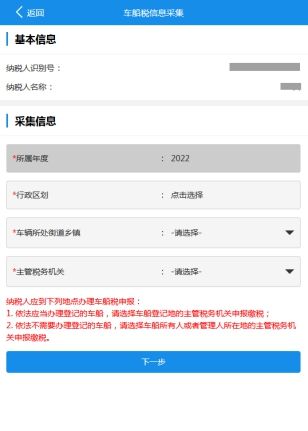 6.当您勾选对应选项后,点击【申报】,便可进入车船税信息采集界面。您需要根据自身情况,选择对应的“行政区划”“车辆所处街道乡镇”“主管税务机关”。