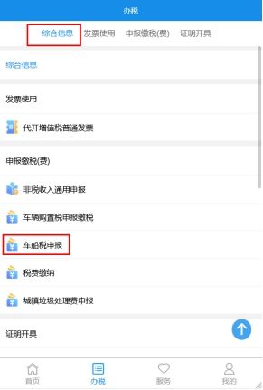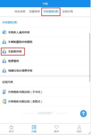 2.登录湖南税务APP后,点击下方【办税】进入办税界面,您可以直接在办税界面找到【车船税申报】,或者通过【申报缴税(费)】找到进入【车船税申报】模块。