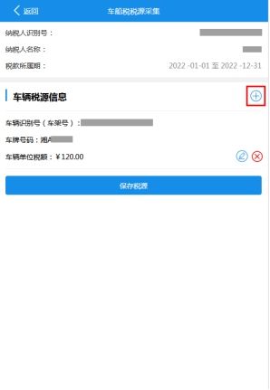 8.点击【下一步】,进入车船税税源采集界面。如果您在上一步选择的是“往年购置车辆”,则会自动为您调出历史已税源采集的车辆信息。如果您在上一步选择的是“新购置车辆”,则需要点击【加号】添加车辆税源信息,进行车船税税源采集。