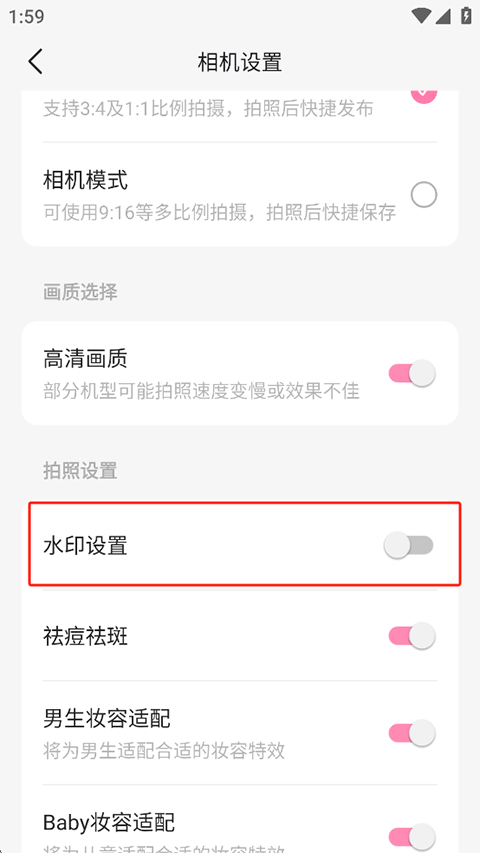 3、找到“水印设置”开关,关闭即可(部分版本显示为滑动按钮)。