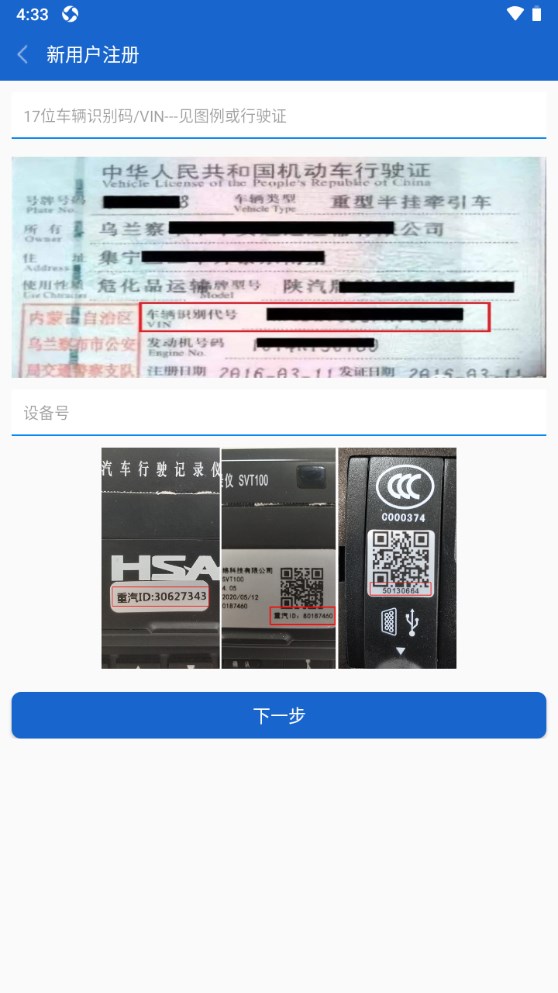 2.输入17位车辆识别码/VIN或行驶证以及设备号。点击下一步