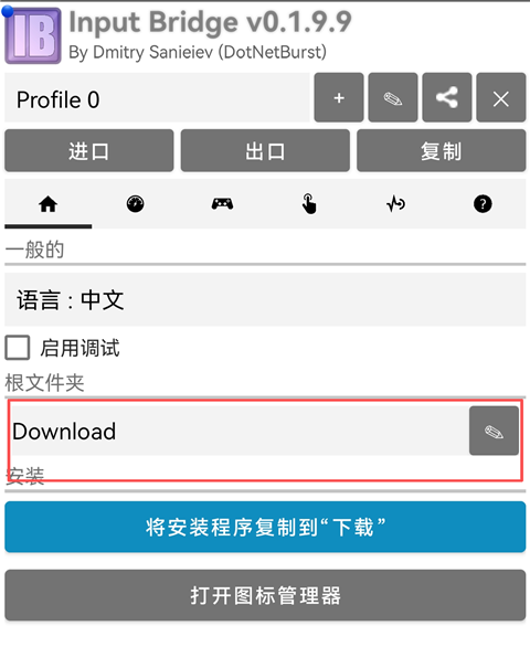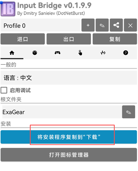 1、打开InputBridge官方版软件,点击【根文件夹】,选择你创建的ExaGear模拟器文件
