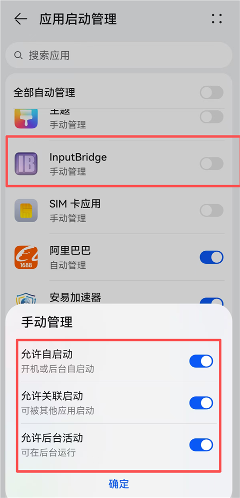 7、回到后台把InputBridge虚拟键盘软件和ExtraGear软件都关闭,华为手机还需前往设置中的应用启动管理中打开【允许自启动、关联启动、后台活动】。