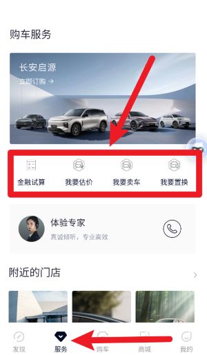 2、在底部导航栏选择“服务”,可以进入购车服务板块,支持估价、卖车、置换等功能的快捷操作入口。