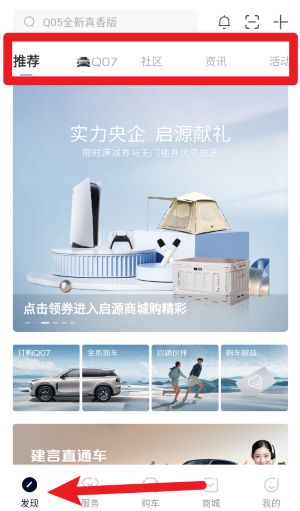 1、点击底部导航栏中的“发现”按钮,可以进入首页内容推荐区,快速浏览最新促销活动和精选商品。