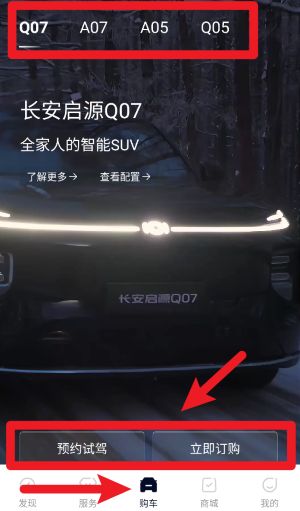 3、点击底部导航“购车”按钮后,可浏览各类车型信息,并支持预约试驾或立即下单等购车相关操作。