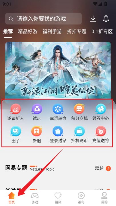 2、进入到软件首页,如图所示,这里有着大量的各种类型的游戏资源。还有各种功能和服务入口。
