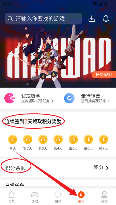 6、而在福利中则可以参与每日的签到赚取金币和积分。