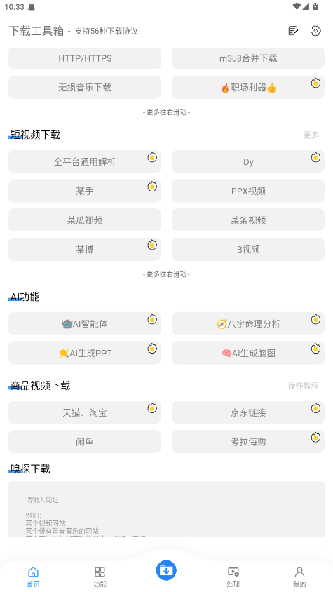 下载工具箱App是一款专注于文件和媒体内容下载的全能工具,提供快速、稳定的下载体验,支持各种文件格式和下载协议。用户可以通过该应用轻松下载应用、文档、视频等内容,操作简单方便。此外,该应用非常纯净,去除了多余的功能和广告,不会打扰用户,尤其是在下载短视频时,智能去除水印,确保用户获取干净、清爽的视频内容。它的简洁设计和高效性能,使其成为下载文件的理想选择。