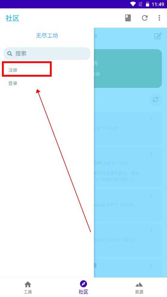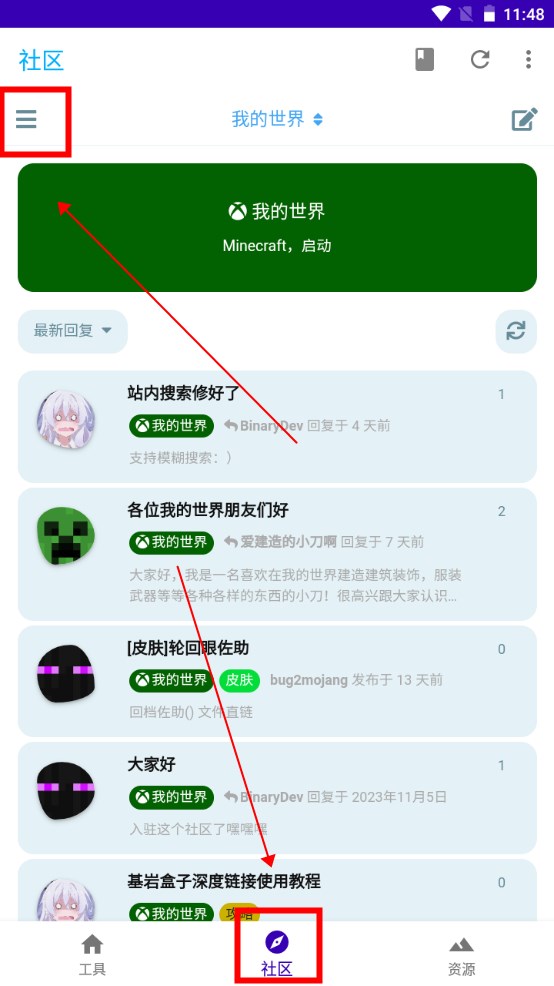 1.击下方导航栏社区按钮,以及左上角三条横杠。