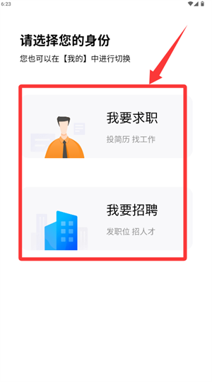 3.最后根据需求选择求职或招聘身份,即可使用对应功能服务。