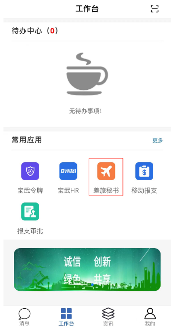 手机登录宝武生态APP,依次选择“工作台-常用应用-差旅秘书”,进入“共享商旅”首页。