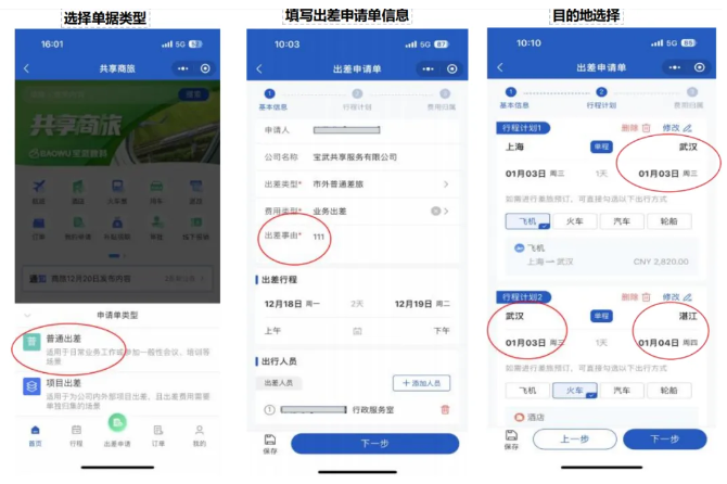 规划具体行程:输入目的地、日期。(多地多路段申请,可在目的地字段按实际出差地进行选择)