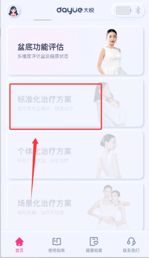 2.打开“大悦盆底”主界面,点击右上角的蓝牙图标,确保手机蓝牙及定位已经打开。