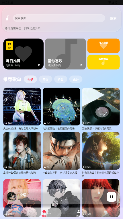 1.在主页上,用户可以根据分类(如新歌、热歌、抖音等)浏览各种音乐,发现新的歌曲。