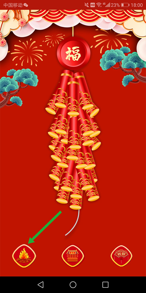 1、打开电子鞭炮app,进入页面后,点击页面底部左侧的如同火堆的图标(下图绿色箭头所指区域即可鸣放电子鞭炮)
