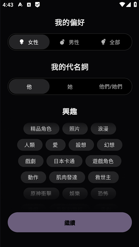 2. 进入“我的偏好”设置页,选择性别倾向、人称代词,并勾选兴趣标签(如“精品角色”“浪漫”等),再点击“繼續”;