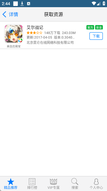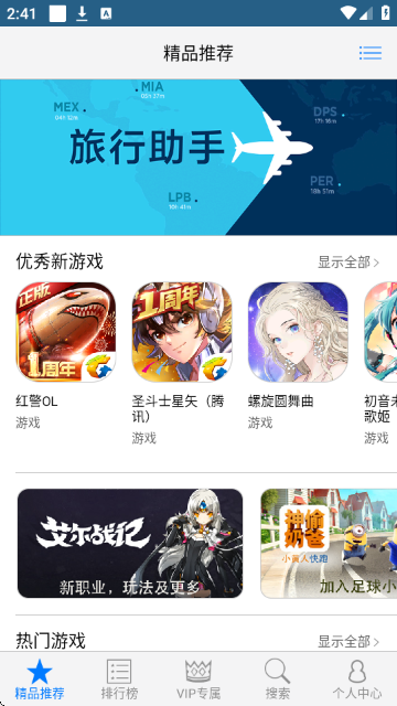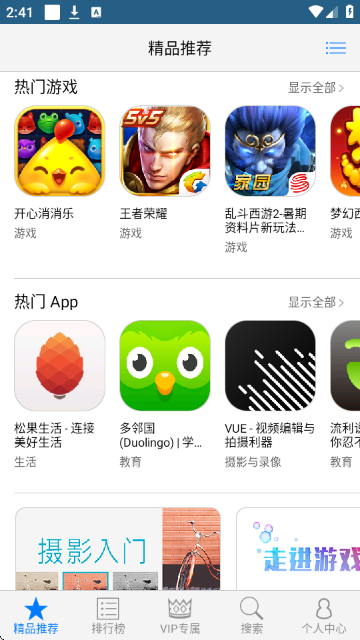 2.向下滑动页面,查看“热门游戏”和“热门App”推荐板块,包含《开心消消乐》《王者荣耀》《VUE视频剪辑》等热门应用,