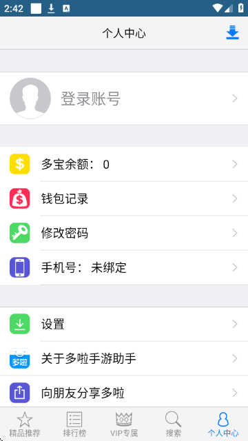 5.点击“个人中心”进入账户管理页面,支持登录账号、查看多宝余额、钱包记录、修改密码、绑定手机号,并可设置应用参数或分享应用给好友。