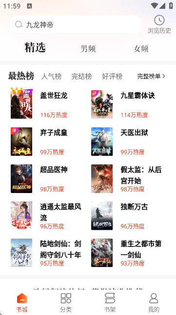 3.选择偏好后,进入“精选”页面,展示当前最热门的小说榜单,如“最热榜”、“人气榜”等,用户可浏览封面与热度信息进行挑选。