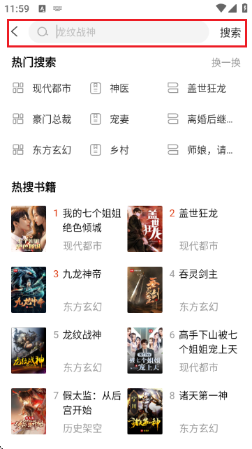 4.在顶部搜索栏中输入关键词(如“九龙战神”),点击“搜索”按钮,即可查看相关书籍的搜索结果及热门推荐。