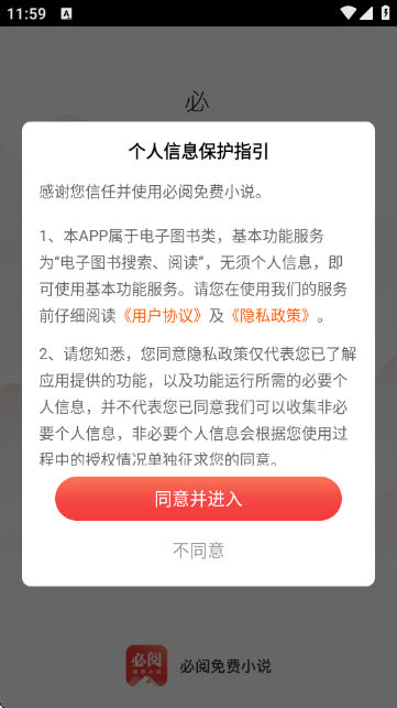 1.打开“必阅免费小说”应用后,系统弹出《个人信息保护指引》页面,用户需阅读隐私政策和用户协议,点击“同意并进入”按钮以继续使用。