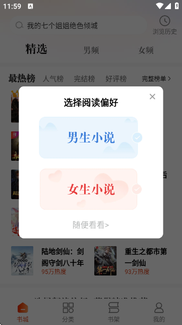 2.进入主界面后,系统弹出“选择阅读偏好”提示框,用户可根据喜好选择“男生小说”或“女生小说”,以便个性化推荐内容。