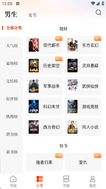 5.点击底部导航栏中的“分类”选项,进入题材与情节分类页面,用户可根据“现代都市”、“东方玄幻”、“复仇”等标签筛选感兴趣的内容。