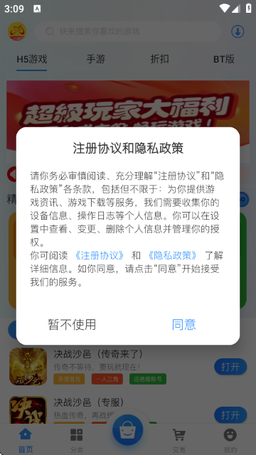 1.打开H5游戏平台应用,首次进入时会弹出“注册协议和隐私政策”提示框,需阅读并点击“同意”以继续使用服务。