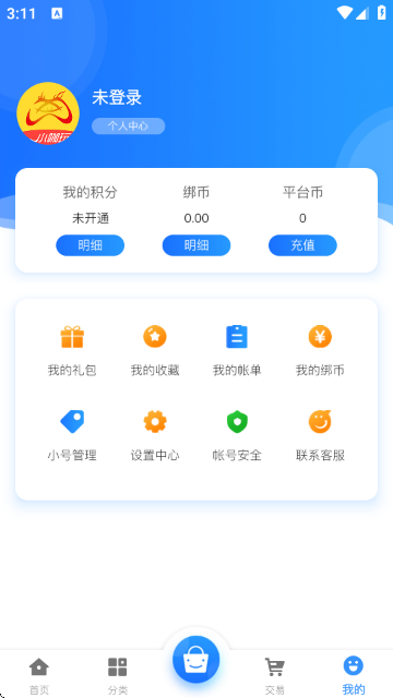9.进入“我的”页面,查看个人账户信息,包括积分、绑币、平台币余额,以及礼包、收藏、账单、小号管理等功能选项。