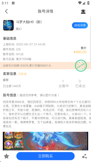 8.点击某个账号详情页(如“斗罗大陆H5(新)”),查看账号基础信息、卖家信息及详细描述,并可点击“立即购买”进行交易。