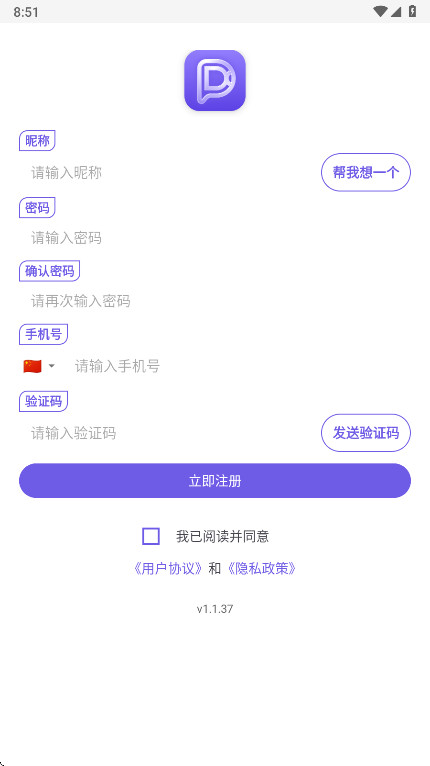 1、在本站下载安装好dkchat,点击下方的【立即注册】按钮,进入账号注册流程,输入昵称、手机号、验证码等信息,设置好密码;