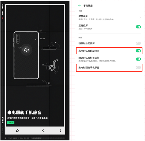 其实这个功能在设置中也可以一步一步打开在设置中打开的方式:【设置】-【便捷辅助】-【体感手势】-进行设置在这个页面,还有一个很好用的功能是来电时贴耳自动接听在洗菜或做饭时手上满是水、油不方便触摸屏幕接电话?开启这个功能后只需要把手机贴近耳朵就可以自动接电话了