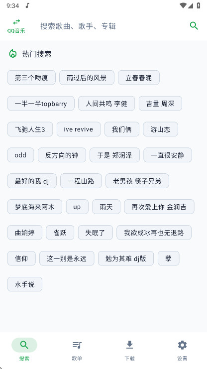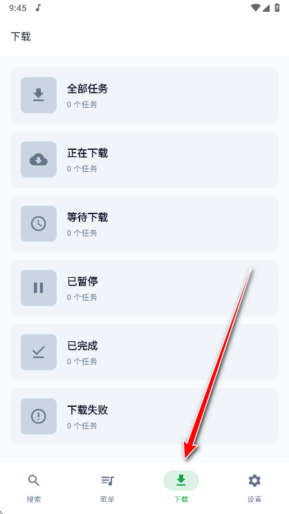 1.打开MPDL音乐,可以看到本软件主要分为搜索、歌单、下载、设置四大板块内容。
