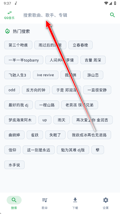 2.在首页上方的搜索框输入歌曲、歌手、专辑名称,即可找到我们喜欢的歌曲进行自由畅听。